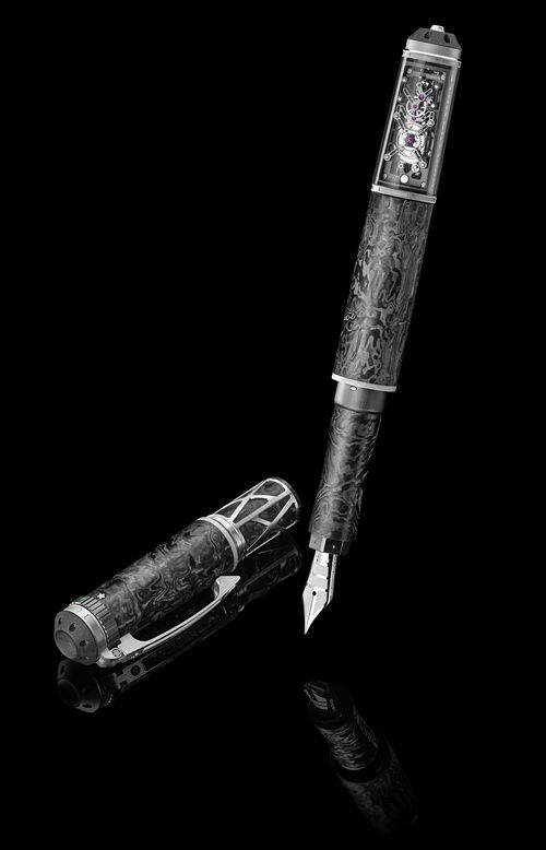 O lançamento desta impressionante caneta-tinteiro de carbono NTPT, que libera mecanicamente sua ponta de escrita em ouro branco 18K sob demanda. Não são necessárias baterias ou módulos eletrônicos para operar esta caneta.